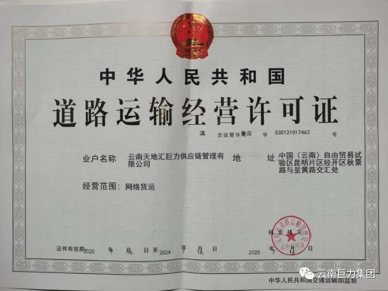 昆明是云南省經濟、政治中心和重要物流樞紐,是東亞大陸與中南、南亞次大陸各國進行經濟貿易往來的陸路樞紐。2020年7月16日,經云南省交通運輸廳能力認定,昆明市道路運輸管理局向云南天地匯巨力供應鏈管理有限公司,頒發(fā)了昆明首張經營范圍核定為“網絡貨運”的道路運輸經營許可證,這是交通運輸部、國家稅務總局制定的《網絡平臺道路貨物運輸經營管理暫行辦法》今年1月1日正式實施以來,云南省開出昆明首張具有“網絡貨運”資質的道路運輸經營許,標志著道路貨運行業(yè)步入“互聯網+貨運”的新歷程。