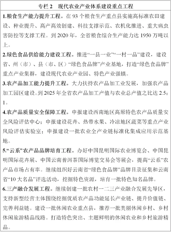 全力穩(wěn)定糧食綜合產(chǎn)能。堅持藏糧于地、藏糧于技,樹立大食物安全觀,立足糧食供需平衡區(qū)的基本省情,確保糧食種植面積穩(wěn)定在6250萬畝左右,在93個稻谷、玉米、小麥等糧食生產(chǎn)重點縣(市、區(qū))集中連片建設(shè)糧食生產(chǎn)核心區(qū),打造一批綠色高質(zhì)高效示范基地。在“九湖兩江”流域大力推廣“水稻+”綜合種養(yǎng)模式,探索水稻田保護(hù)和農(nóng)業(yè)綠色生態(tài)發(fā)展路徑。努力挖掘糧食生產(chǎn)潛能,大力發(fā)展晚秋糧食生產(chǎn)和冬季農(nóng)業(yè)開發(fā),擴(kuò)大小雜糧、小雜豆、馬鈴薯、鮮食玉米等糧食作物面積。到2025年,全省糧食產(chǎn)量達(dá)1950萬噸。縱深推進(jìn)特色產(chǎn)業(yè)發(fā)展。圍繞糧食、茶葉、花卉、水果、蔬菜、堅果、咖啡、中藥材、生豬、肉牛等“綠色食品牌”重點產(chǎn)業(yè),深入實施“一二三”行動,打造“一縣一業(yè)”,抓住種子和電商兩端,推進(jìn)設(shè)施化、有機(jī)化、數(shù)字化發(fā)展。到2025年,“綠色食品牌”重點產(chǎn)業(yè)綜合產(chǎn)值實現(xiàn)翻番。穩(wěn)定糖料蔗產(chǎn)能。鞏固臨滄市、普洱市、德宏州、西雙版納州等適宜區(qū)種植面積,加快中低產(chǎn)蔗田改造,加強(qiáng)適宜丘陵山地機(jī)具的研發(fā)和推廣應(yīng)用,到2025年,全省糖料蔗產(chǎn)量穩(wěn)定在1600萬噸左右。促進(jìn)橡膠產(chǎn)業(yè)轉(zhuǎn)型升級。擴(kuò)面增產(chǎn)、強(qiáng)質(zhì)提特、輻射全國,西雙版納州、普洱市等地區(qū)加快發(fā)展特種膠園,因地制宜發(fā)展生態(tài)膠園,打造國內(nèi)天然橡膠生產(chǎn)供應(yīng)主基地。加快綠色生態(tài)漁業(yè)發(fā)展。
