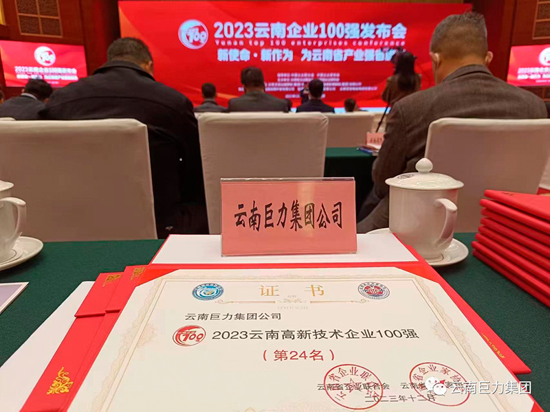 2023年12月16日上午,云南省企業(yè)家聯(lián)合會、云南省企業(yè)家協(xié)會在云南海埂會堂召開“2023 云南企業(yè) 100 強”發(fā)布會。云南巨力集團榮獲:“2023云南企業(yè)100強”“2023云南民營企業(yè)100 強”“2023云南制造業(yè)企業(yè)100強”“2023云南高新技術(shù)企業(yè)100強”四項殊榮。