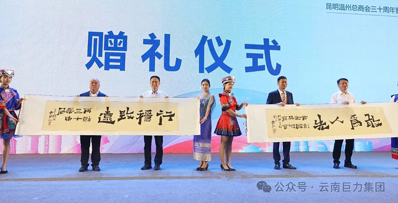 溫州市全國(guó)溫州商會(huì)向昆明溫州總商會(huì)贈(zèng)送紀(jì)念牌匾及書(shū)法作品,昆明市總商會(huì)也向昆明市工商聯(lián)贈(zèng)送書(shū)法作品,彰顯了溫商群體深厚的文化底蘊(yùn)和家國(guó)情懷。